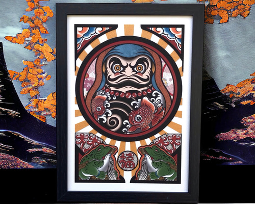 | 商品の特徴 | 尾九 画 刺青青達磨 金魚 A4サイズ フレーム付き イラスト。。。#松本大洋#大友克洋#花井祐介#岡本太郎#草間彌生 | ||
