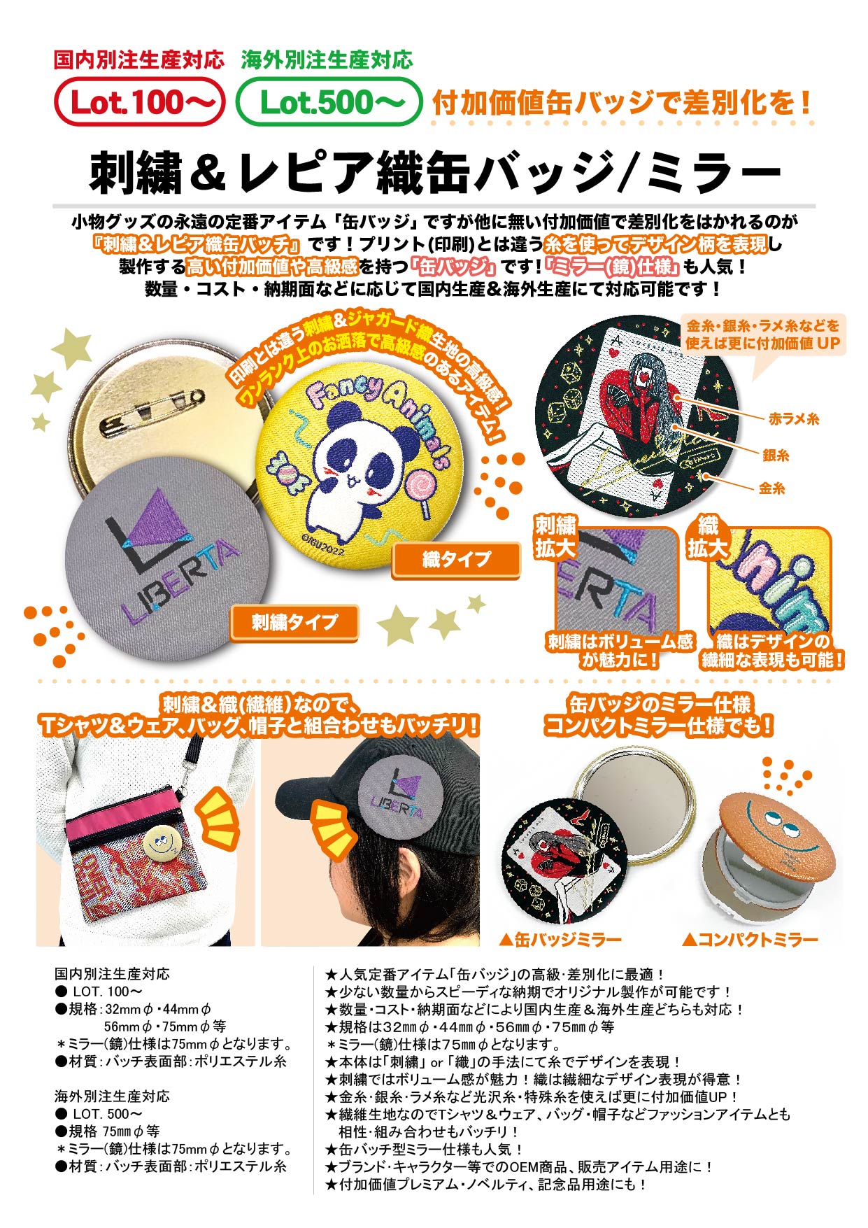 | メーカー | 缶バッジ、名刺おまとめ買い 刺繍&レピア織缶バッジ/ミラー |
