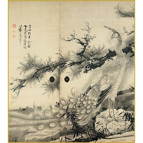 - 美術品・アンティーク・コレクション > 絵画 > 【真作】津田白印/寿松図/松図/老松図/横物/掛軸/名家伝来/AC-232 色紙 松に孔雀図襖 /曾我蕭白 筆 : 京都からの逸品 アート和風館