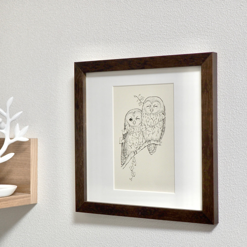 - 美術品・アンティーク・コレクション > 絵画 > 足田メロウ 原画 直筆サイン 絵画 希少 ペガサス フラワー ピンク 額付き 原画「くっつきふくろう」ペン画・額入り絵画・ハガキサイズ