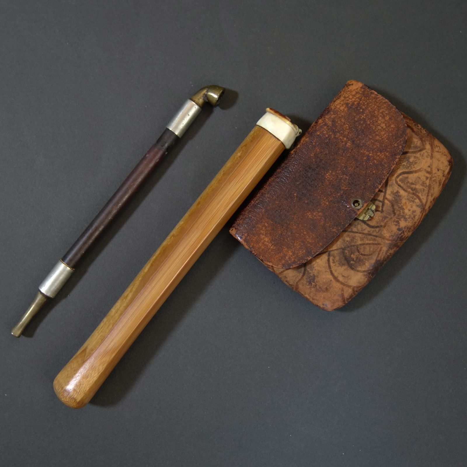 時代物 煙管 煙草入 煙管筒 金口 細工 彫刻 一式 骨董 アンティーク 煙管 煙管筒 煙草入 【 煙管 真鍮+銀製 / 煙管筒 竹製 / 煙草入