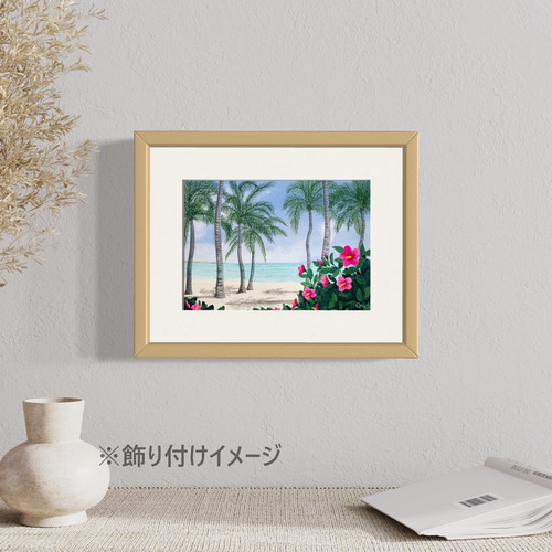 - 美術品・アンティーク・コレクション > 絵画 > 透明水彩画 原画 「ハイビスカスとプルメリア」額縁付 F4サイズ 海 風景画 ヤシの木とハイビスカス」透明水彩画 原画 風景画 額縁付 SM