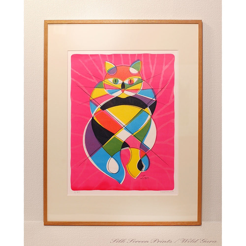 - 美術品・アンティーク・コレクション > 絵画 > 額付きシルクスクリーン応用絵画 title「みんな待ってる花猫ニャンコ」 猫のシルクスクリーン版画フレーム-1 | 野性のグラ(小全紙