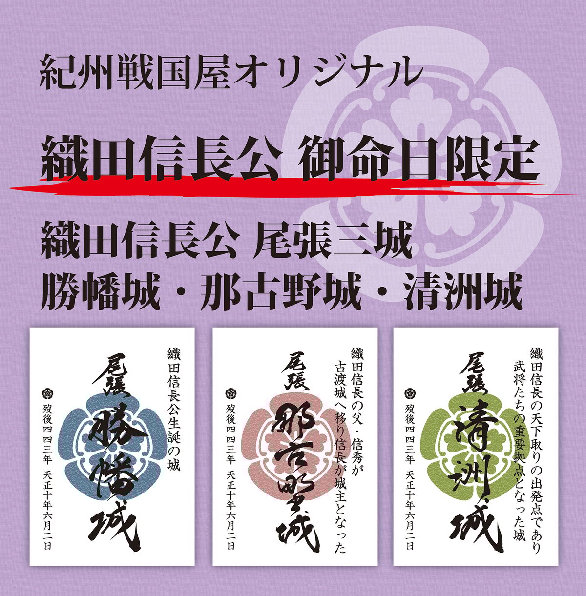 | 商品の特徴 | fit=scale-down,w=1200。勝幡城 御城印 織田信長公 御命日限定版 | 全国御城印。勝幡城 御城印 織田信長公 御命日限定版 | 全国御城印。織田信長公 御命日限定セット | 紀州戦国屋オンラインストア。。♯織田信長公尾張三城♯勝幡城♯那古野城♯清洲城♯御朱印♯御城印♯武将印♯値引き可 | ||