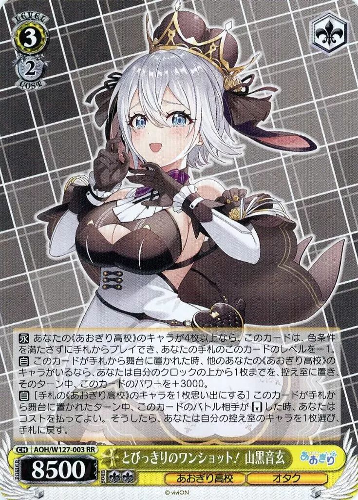| 商品の特徴 | 中古】ヴァイスシュヴァルツ AOH/W127-003[RR]:とびっきりの。Aogiri-High-。89066-268-。ヴァイスシュバルツのあおぎり高校ブースターのRRとびっきりのショット!山黒音玄×2枚我部りえる×3枚音霊萌実×2枚魂子×3枚の10枚セットです。。VTuberグループ『あおぎり高校』が「ヴァイスシュヴァルツ」「Re。全て開封後すぐにスリーブに入れておりますので目立った傷などはないとおもいますが念の為、プレイ用でお願いいたします。 | ||
