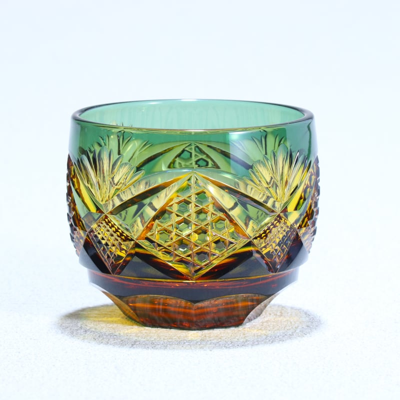 - 美術品・アンティーク・コレクション > 工芸品 > #XG331 ガラス工芸作家・黒木国昭・綾切子・銘「猪口」・骨董・アンティーク 猪口「綾切子」 アンバー/グリーン | グラスアート黒木 | 公式