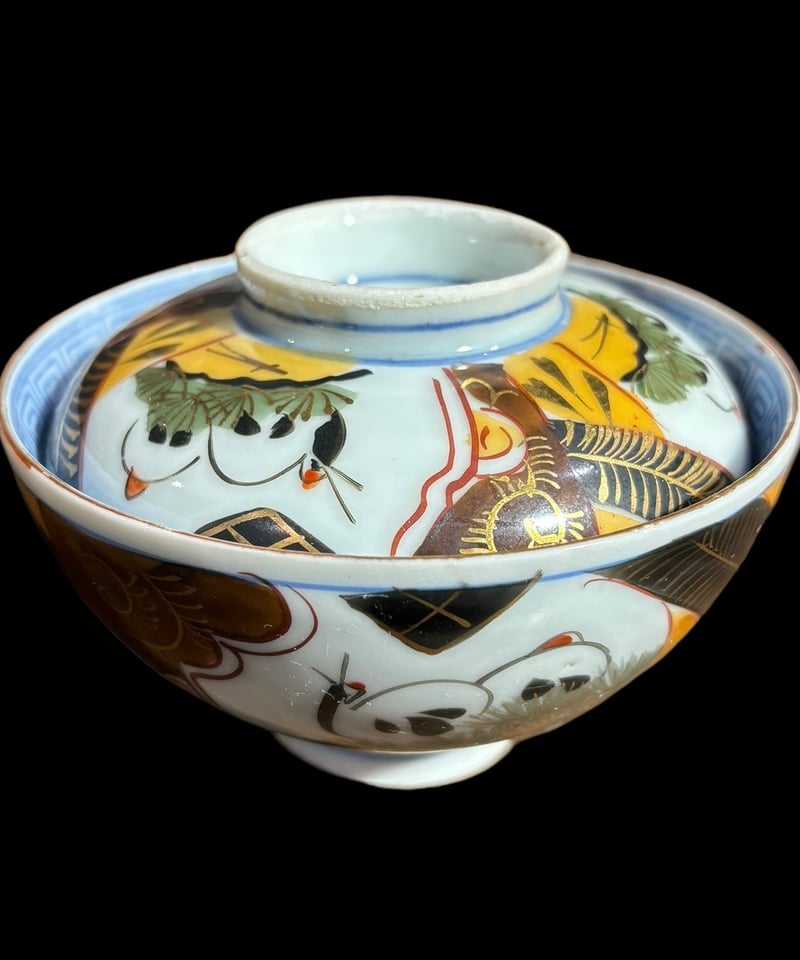 - 美術品・アンティーク・コレクション > 工芸品 > 限定最終処分特価古伊万里色絵蓋付お茶碗五客煮物鉢 大きめ 完品 食卓のインテリア 色絵 蓋付き お椀 [鶴松紋柄] 丼 蓋付き丼 ご飯 どんぶり 伊万里
