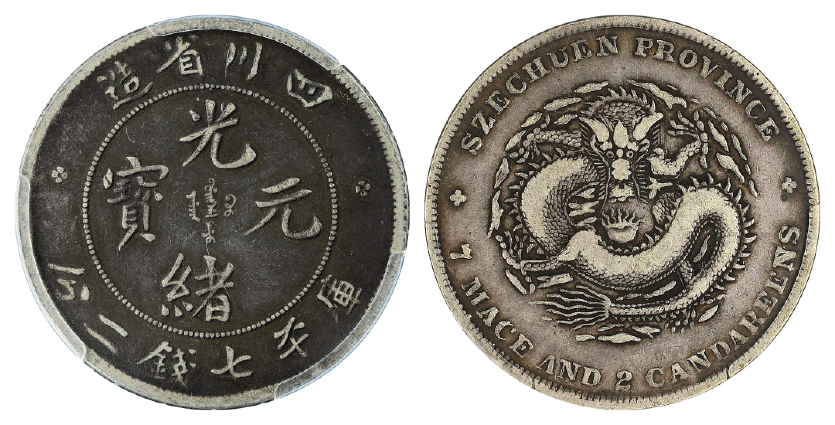 蔵出 四川省造 光緒元寶 庫平七銭二分 銀貨 中国古銭 旧貨幣 銀弊 四川省造光绪元宝库平七钱二分银币,兔龙版PCGS VF30 - 宜和拍卖